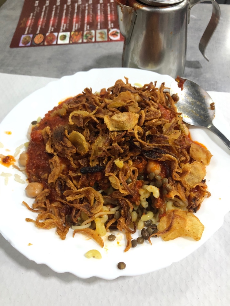 c'est la première fois que je mange des plats égyptiens franchement la bouffe était bonne on a pris mlokhiya, mahchi farci, pigeon farci et d'autre chose. Les gens sont hyper sympa ils nous ont expliqué chaque plat ils sont adorable et vers la fin ils nous offrent du kouchari gratuitement.