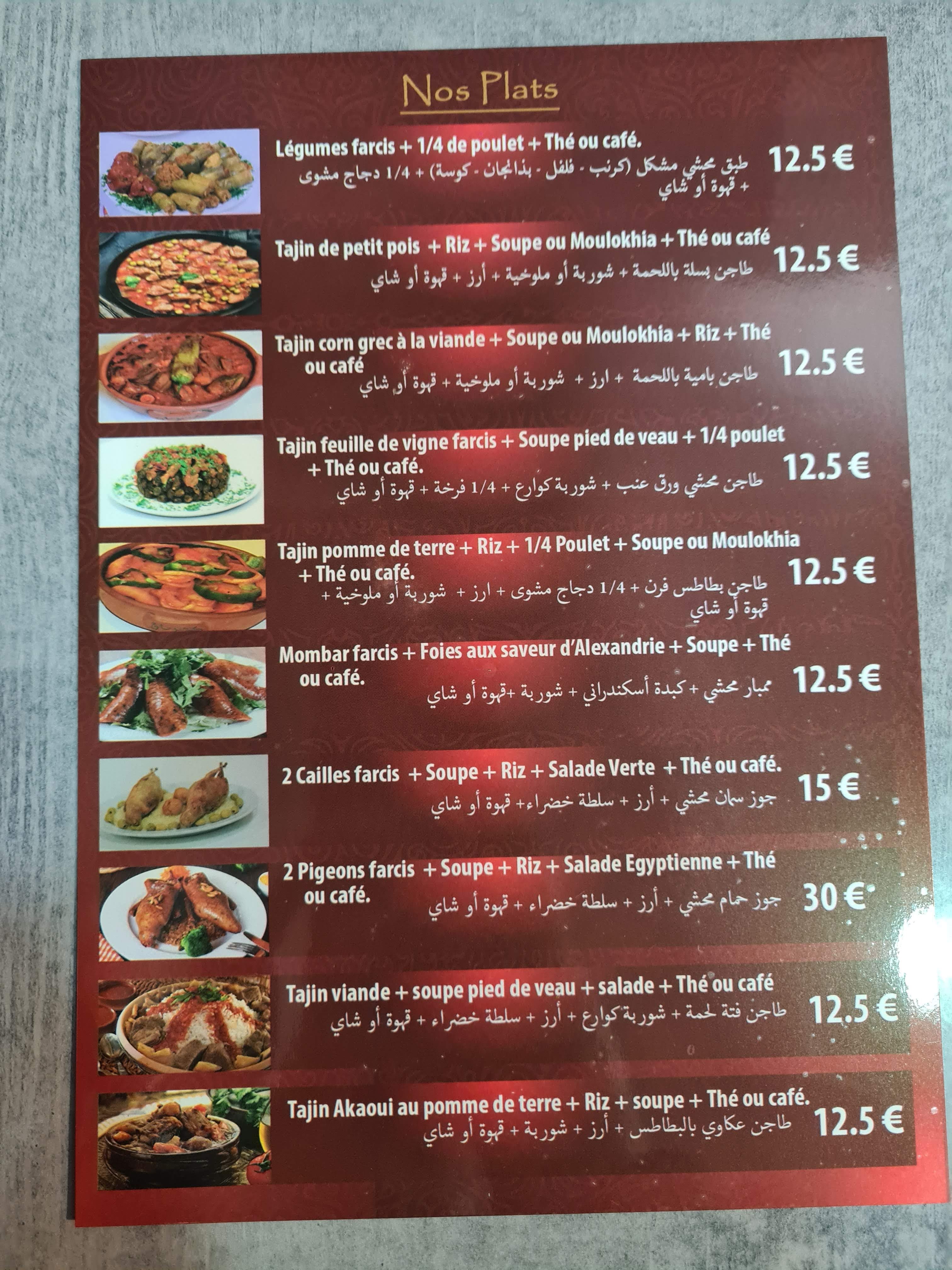 Franchement j essayer la première fois hier soir et j était étonner par le goût des plats c était tellement bon honnêtement je recommande à tous le monde si vous êtes envie d être en Égypte directement de Paris c la bas plats épicé c top A visiter !!!!!!